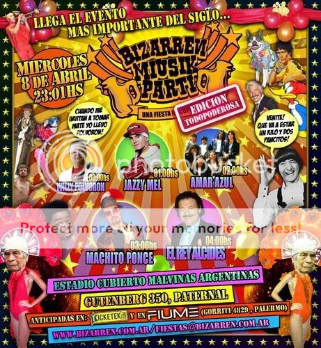 Desde Carlitos Bala hasta Gilda. Desde Michel Fugain con su Attention Mesdame et Messieurs hasta Xuxa con su Ilari lari larie fue la amalgama de personajes se dieron cita en la ultima Bizarren Miusik Parti que tuvo lugar el pasado miércoles 9 de abril en una edición Todopoderosa, y déjenme decirles una cosa: La Fiesta bizarra (tal es su nombre para los amigos) no es ni mas ni menos lo que anuncia su nombre.